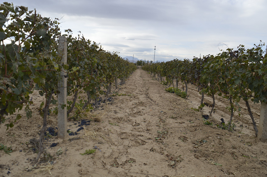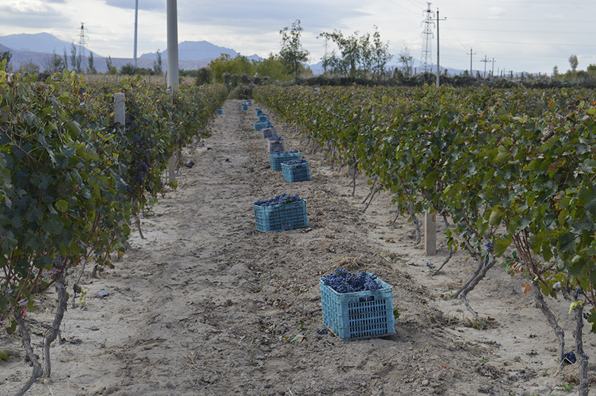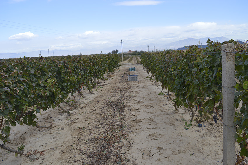 一行行马瑟兰葡萄藤,通过种植工人娴熟的精选采摘,好的已经装入筐里,品相不好的仍然留在藤架上,做为最好的肥料回归到葡萄藤的根系土壤里。